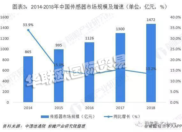 麥肯錫報告指出,到2025年,物聯(lián)網(wǎng)帶來的經(jīng)濟效益將在2.7萬億到6.2萬億美元之間,其中傳感器作為物聯(lián)網(wǎng)技術(shù)最重要的數(shù)據(jù)采集入口,將迎來廣闊的發(fā)展空間。據(jù)中國信通院數(shù)據(jù)顯示,近年來中國傳感器市場規(guī)模保持較快增長,2018年達到1472億元,同比增長13.2%,近5年均保持兩位數(shù)的增長率。