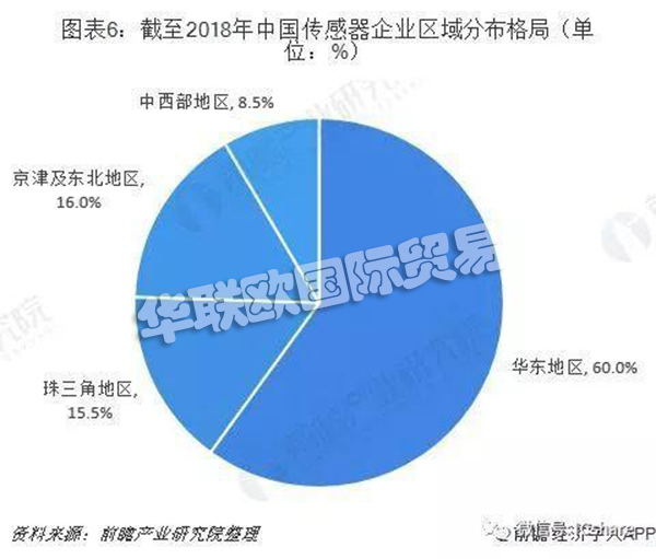 從企業(yè)分布來看,傳感器企業(yè)主要分布在華東地區(qū)、京津及東北地區(qū)、珠三角地區(qū)、中西部地區(qū)四大產(chǎn)業(yè)聚集區(qū)。其中,華東地區(qū)傳感器企業(yè)數(shù)量最多,約占全國企業(yè)總數(shù)的60%,珠三角地區(qū)約占15.5%,京津及東北地區(qū)約占16%,中西部地區(qū)約占8.5%。此外,傳感器產(chǎn)業(yè)伴隨著物聯(lián)網(wǎng)的興起,在其它區(qū)域,如陜西、四川和山東等地也逐步發(fā)展起來。
