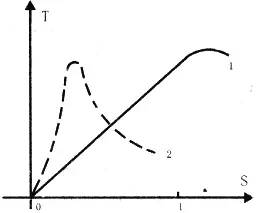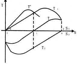 正常運轉的伺服電動機,只要失去控制電壓,電機立即停止運轉。當伺服電動機失去控制電壓后,它處于單相運行狀態,由于轉子電阻大,定子中兩個相反方向旋轉的旋轉磁場與轉子作用所產生的兩個轉矩特性(T1-S1、T2-S2曲線)以及合成轉矩特性(T-S曲線)