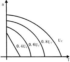 圖5是伺服電動機單相運行時的機械特性曲線。負載一定時,控制電壓Uc愈高,轉速也愈高,在控制電壓一定時,負載增加,轉速下降。