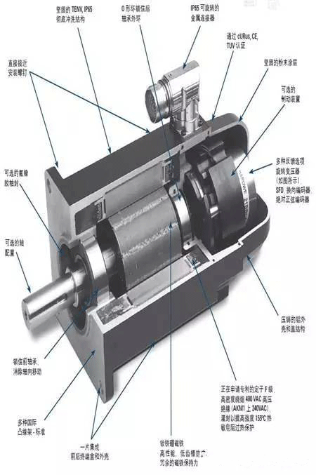 伺服電機內部的轉子是永磁鐵,驅動器控制的U/V/W三相電形成電磁場,轉子在此磁場的作用下轉動,同時電機自帶的編碼器反饋信號給驅動器,驅動器根據反饋值與目標值進行比較,調整轉子轉動的角度。伺服電機的精度決定于編碼器的精度(線數)。