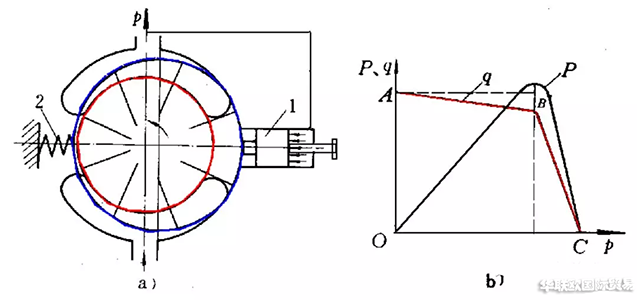 限壓式變量葉片泵如圖19所示,限壓式變量葉片泵定子右邊控制活塞作用著泵的出口壓力油,左邊作用著調壓彈簧力,當FFt,定子將向偏心減小的方向移動,泵的輸出流量減小。