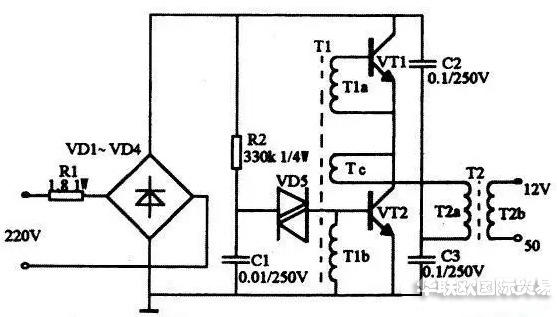 如圖所示。DAYKIN變壓器原理與開關電源工作原理相似,二極管vd1~vd4構成整流橋把市電變成 直流電,由振蕩變壓器t1,三極管vt1、vt2組成的高頻振蕩電路,將脈動直流變成高頻電流,然后由鐵氧體輸出變壓器t2對高頻高壓脈沖降壓,獲得所需 的電壓和功率。r1為限流電阻。電阻r2、電容c1和雙向觸發(fā)二極管vd5構成啟動觸發(fā)電路。 三極管vt1、vt2選用s13005,其b為 15~2 0倍。也可用c3093等buceo>=35ov的大功率三極管。觸發(fā)二極管vd5選用32v左右的db3或vr60。振蕩變壓器可自 制,用音頻線繞制在 h7 x 10 x 6的磁環(huán)上。tia、t1b繞3匝,tc繞1匝。鐵氧體輸出變壓器t2也需自制,磁心選用邊長27mm、寬 20mm、厚10mm的ei型鐵氧體。t2a用直徑為0.45mm高強度漆包線繞100匝,t2b用直徑為1.25mm高強度漆包線繞8匝。 二極管 vd1~vd4選用 in4007型,雙向觸發(fā)二極管選用db3型,電容c1~c3選用聚丙聚酯滌綸電容,耐壓250v。