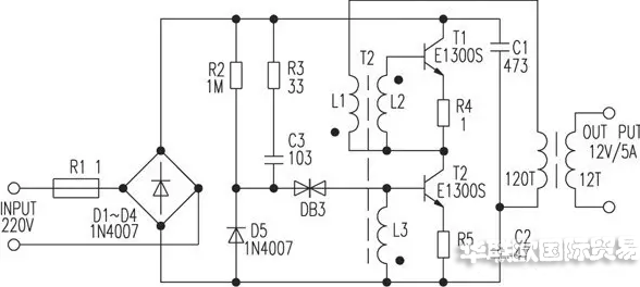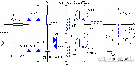 電路正常工作時,A點工作電壓約為215V,B點約為108V,C點約為10V,D點約為25V。如果不振蕩,檢查VT1、VT2及L1、L2、L3的相位是否正常(交換L3的兩根接線即可)。改變L5的匝數(shù)可改變輸出電壓。