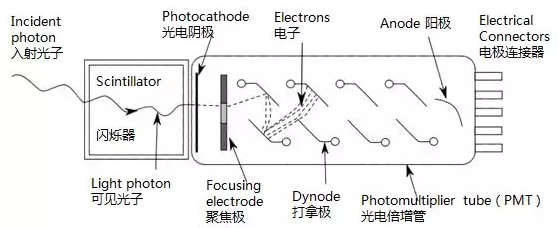 光電倍增管分為頂窗型(Head-on)和側(cè)窗型(Side-on)兩種結(jié)構(gòu),內(nèi)部包含光電陰極、聚焦極、多個倍增極(二次發(fā)射極)和陽極,每個倍增電極上的電壓都高過它前面一個電極,使得電子能夠逐級加速。入射光子撞擊光電陰極產(chǎn)生光電效應(yīng),激發(fā)出的光電子被聚焦到倍增系統(tǒng),經(jīng)過一連串的二次發(fā)射使得電子倍增,最后到達(dá)陽極作為信號輸出。