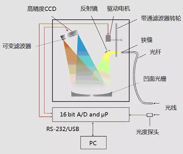 典型的多色儀的光路如下圖所示,光線經(jīng)光纖引導(dǎo)至入射狹縫并投射到準(zhǔn)直物鏡上,準(zhǔn)直物鏡將發(fā)散光變成平行光再反射到衍射光柵上,經(jīng)光柵分光形成光譜光束,然后經(jīng)聚焦鏡后在焦平面上形成光譜帶。置于焦平面上的探測器的不同像素位置對應(yīng)不同的波長,并且感應(yīng)的電壓大小對應(yīng)于該像素接收光強(qiáng)的大小。這樣,通過掃描探測器各像素點的輸出電壓,就可以得到光譜的功率分布P(λ),然后據(jù)此計算相關(guān)光色參數(shù)。