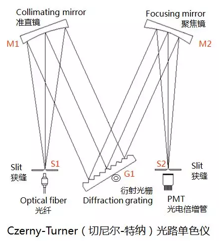 單色儀的光路如下圖所示,光源或照明系統(tǒng)發(fā)出的復(fù)合光線經(jīng)光纖引導(dǎo)至入射狹縫并投射到準(zhǔn)直反射鏡上,經(jīng)準(zhǔn)直反射鏡將發(fā)散光變換為平行光束再照射到衍射光柵,利用每個波長離開光柵的角度不同,由聚焦反射鏡再把某一波長的單色光反射到出射狹縫,光電倍增管(PMT)就可以測定這個波長的數(shù)值和強(qiáng)度。光柵在步進(jìn)電機(jī)的帶動下勻速轉(zhuǎn)動,出射狹縫就可以得到不同波長的單色光,通過同步讀取光柵角度和光電倍增管的輸出信號,就可以得到復(fù)合光的全部光譜信息。