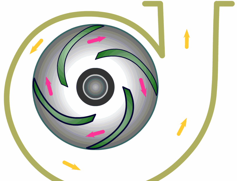 開泵后,泵軸帶動(dòng)葉輪一起高速旋轉(zhuǎn)產(chǎn)生離心力。液體在此作用下,從葉輪中心被拋向葉輪外周,壓力增高,并以很高的速度(15-25 m/s)流入泵殼。