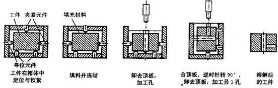 RL&SM 通用夾具系統采用規范化的板塊結構,構成可拆卸的RL&SM 箱體,作為通用夾具系統在機床上快速尋位的基準和記憶工件初始安裝信息的實體模型;箱體的各個板塊上裝有可便利調節的工件尋位元件,其固定后的實際位置通過測量獲得,并由數據采集系統送入信息處理系統;工件通過尋位元件確定其在箱體中的初始位置,預緊后注入低熔點合金凝固形成工件的初始安裝姿態,使工件、填料和箱體形成一個整體——工件夾具系統。