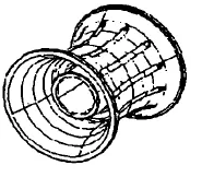 (2) 鞍形轉子:這是一個具有雙曲面外輪廓的高速回轉件(見圖10)。環壁薄、精度要求高,由于加工時易于產生變形,傳統生產中采用互為基準、反復進行工序轉換加工成形的方法,不僅加工效率低,而且需要各種專用工裝,采用柱形的RL&SM 通用夾具,通過填料增加了工件的剛性,避免了互為基準反復加工的工藝過程,減少工序轉換次數,提高切削效率,減少了專用工裝的花費,即設計、制造周期和成本等。