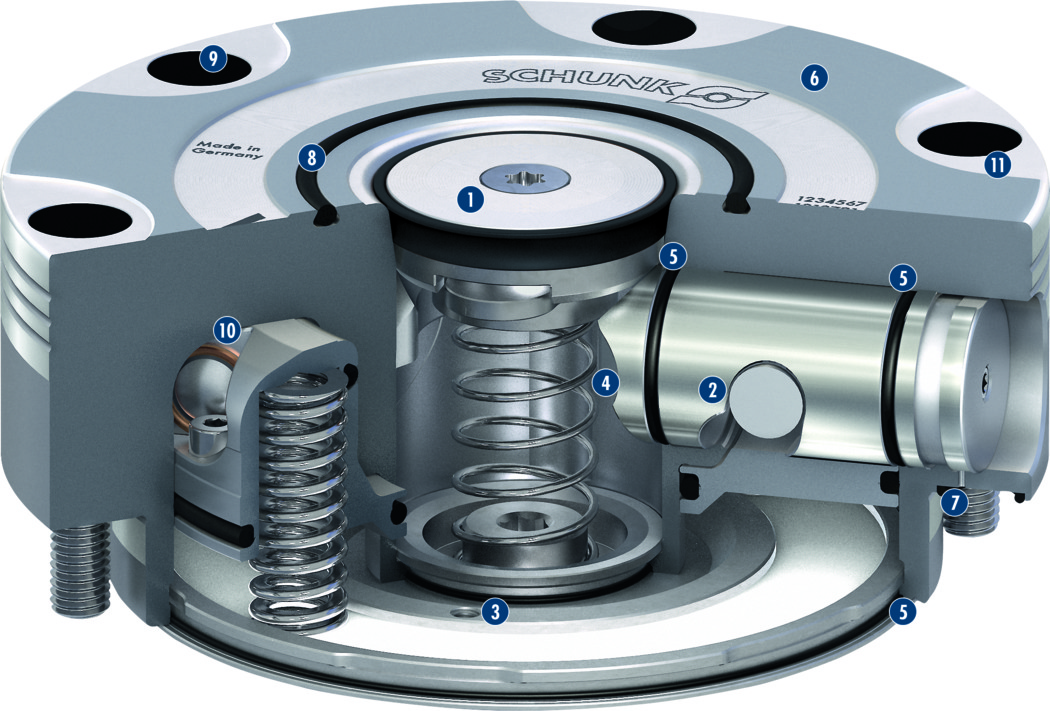 夾持過程由集成的彈簧組件執(zhí)行。動力傳遞通過專利驅(qū)動機構(gòu)實現(xiàn),它將有效的彈簧力轉(zhuǎn)換為定位銷的最大下拉力。夾持自動鎖定,下拉力可在集成渦輪增壓功能的幫助下增加。可使用6 bar系統(tǒng)壓力打開。
