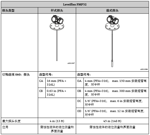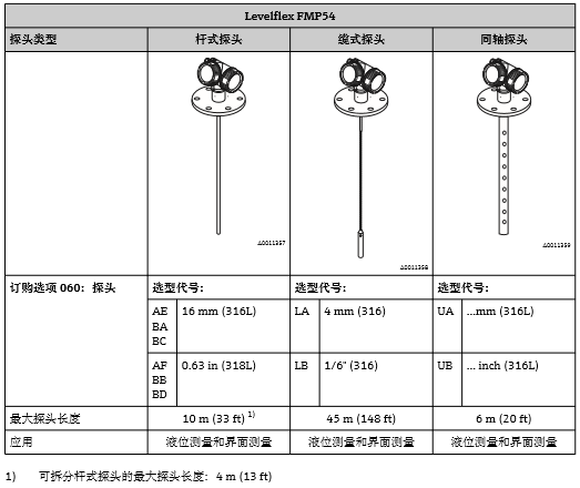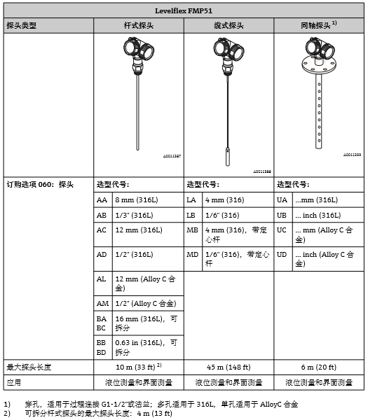 通常,使用桿式探頭或同軸探頭進(jìn)行液位測量。纜式探頭用于量程超過10 m (33 ft)時的液位測 量(FMP52:量程超過4 m (13 ft)), 以及罐(倉)頂間隙不允許安裝桿式探頭的測量條件下的液位測量。