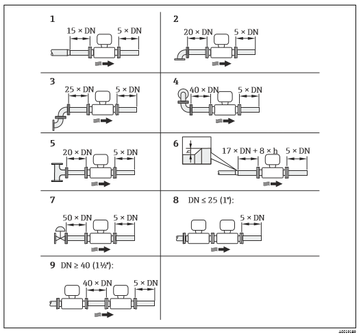 h 管道擴徑時產(chǎn)生的高度差 1 一級縮徑管 2 單向彎頭(90°彎頭) 3 雙向彎頭(2 × 90°彎頭,相對) 4 3D雙向彎頭(2 × 90°彎頭,相對,不在同一平面上) 5 三通 6 擴徑管 7 控制閥 8 兩臺測量設(shè)備并排安裝,DN ≤ 25 (1"):直接法蘭對法蘭安裝 9 兩臺測量設(shè)備并排安裝,DN ≥ 40 (1½"):安裝間隙參考圖示說明