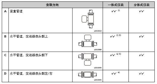 3) 測量熱介質(zhì)時(例如:蒸汽或流體溫度(TM)超過200 °C (392 °F),選擇安裝方向C或D。 4) 測量冷介質(zhì)(例如:液氮)時,選擇安裝方向B或D。