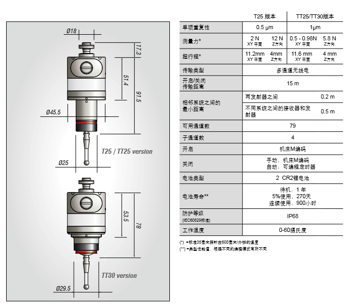 MARPOSS無線傳輸測頭WRP45測頭屬于無線電傳輸觸發式測頭,利用模塊化設計,可以滿足用戶的任何需求。適用于MARPOSS T25、TT25及TT30觸發式測頭的各種場合,并與WRI接收器兼容。WRP45小尺寸和無線電發射特性適用于多坐標銑床和加工中心上,這為不能保證發射器和接收器間視野的應用提供了重要的 優勢。